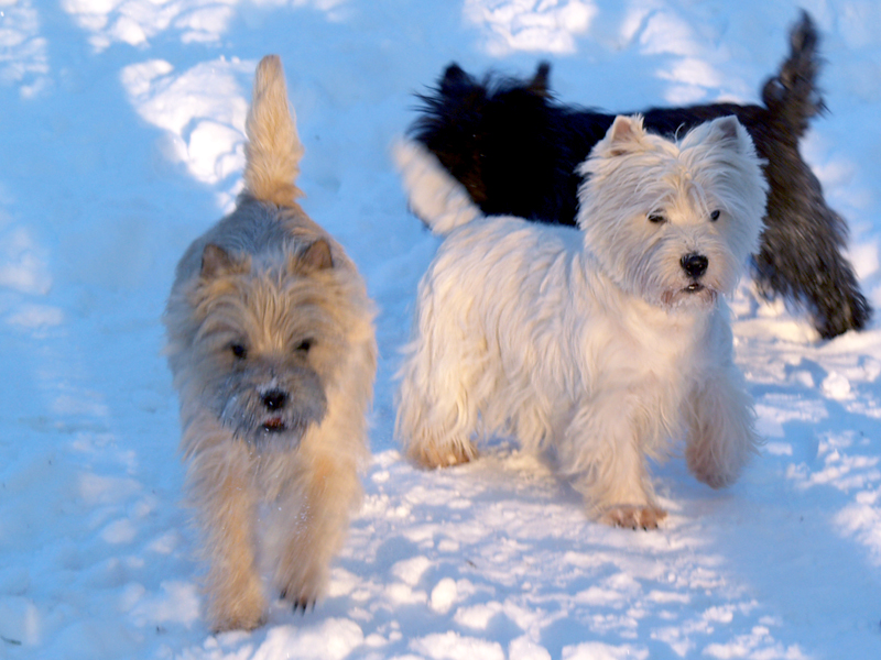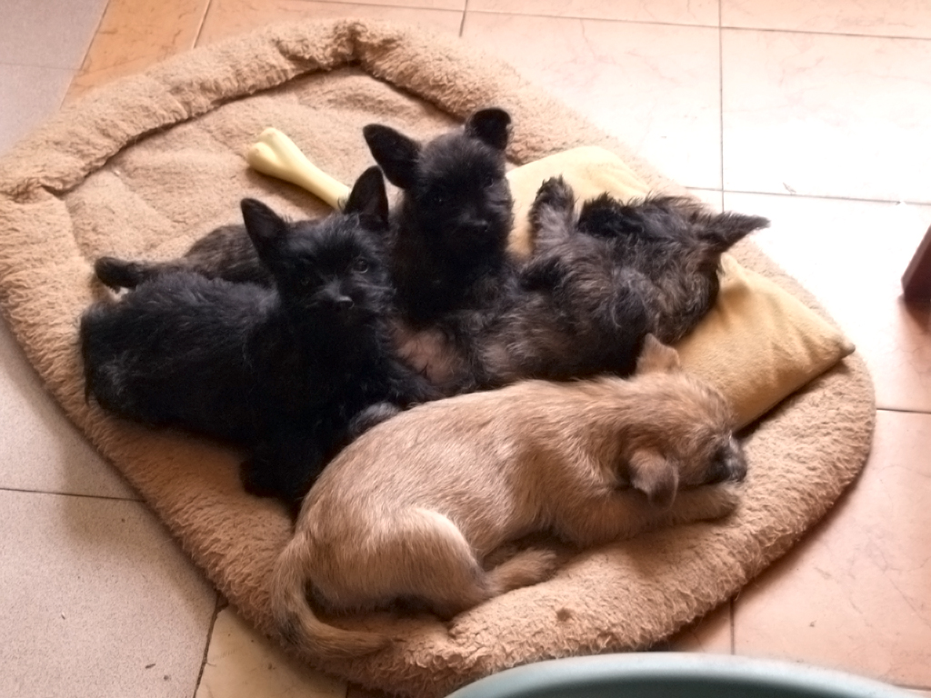 Cairny ujęły nas swoim roziskrzonym wzrokiem, wspaniałym charakterem i wysoką inteligencją. Jak małe włochate silniczki "perpetuum mobile" krążą wśród nas. Wszystkie nasze psy mieszkają z nami w domu. To niezwykłe doświadczenie móc obserwować wielopokoleniowe rodziny obu tych ras w jednym domu. Relacje pomiędzy starszymi, młodzieżą i szczeniakami dostarczają wiele emocji. Nasze małe szczenięta "wychodzą na dom" i zapoznają się z dorosłymi i młodszymi psiakami w wieku 5-6 tygodni. Wówczas mają miejsce całe mnóstwo komicznych sytuacji.